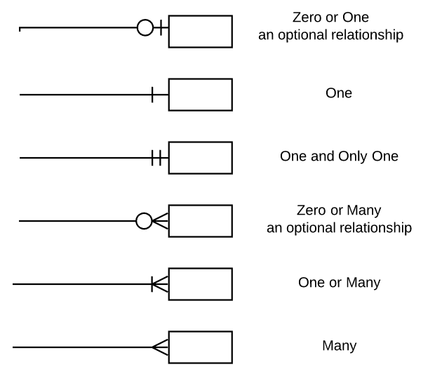E-R 다이어그램을 만들 때 테이블 간 관계 표현 시 일일히 숫자표기하기 번거로우므로 위와 같은 방법(Crow's foot notation)을 주로 사용한다.
