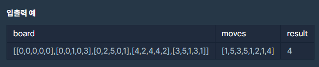 - moves 배열 각 원소들의 값은 1 이상이며 board 배열의 가로 크기 이하인 자연수입니다.