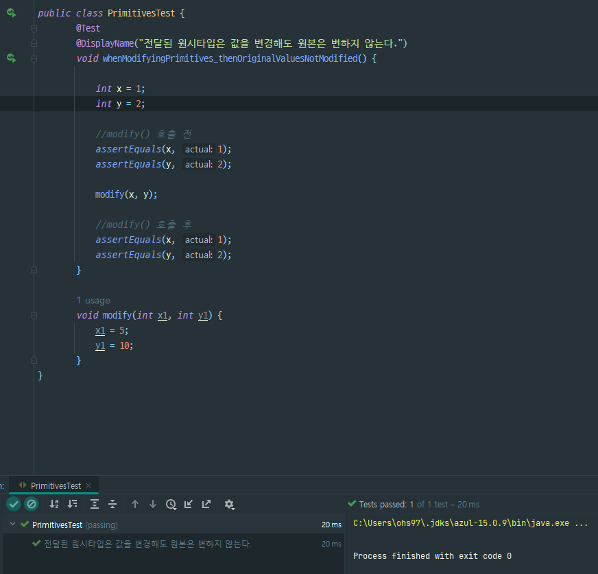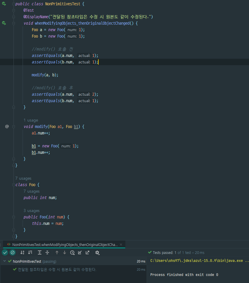 두 인용문을 근거로 Java에서는 pass-by-value방식을 채택하고 있음을 알 수 있다.