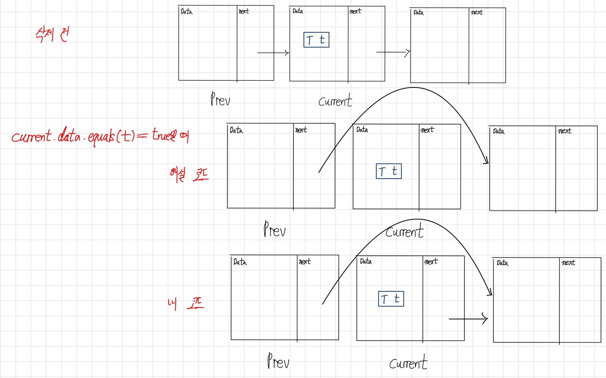 이해를 돕기 위해 소스 코드와, delete메서드 호출 시 LinkedList의 변화를 그림으로 나타내었다.