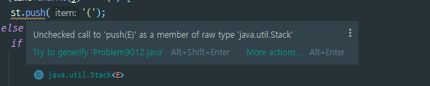 Stack클래스가 제네릭 타입임을 잊어버리고 타입 파리미터를 생략한 채로 풀게 되었는데, IDE에서 경고메시지를 보내긴 했지만 컴파일하고 실행하는 데는 문제가 없었다.