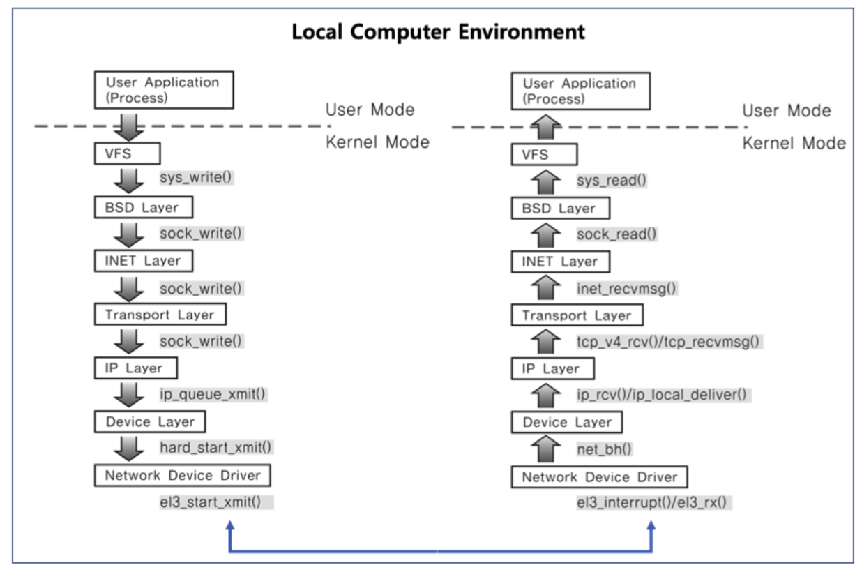 다음 이미지는 소켓을 사용한 로컬 컴퓨터간의 통신 과정을 설명한 것이다. 아래 계층을 내려가면서 송신을 하고, 아래 계층부터 위로 올라가면서 대상 프로세스가 수신을 하는 방식이다.
