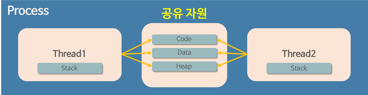 코드, 데이터, 힙을 서로 공유하는 스레드와는 다르게 프로세스는 코드, 데이터, 스택, 힙을 독립적으로 가진다.