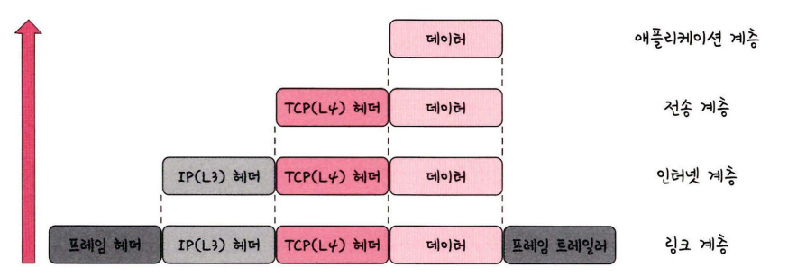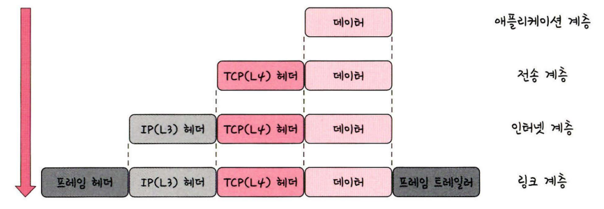 상위 계층에서 하위 계층으로 데이터를 전송할 때 각 계층에서 헤더와 트레일러 정보를 추가하여 데이터를 패킷 형식으로 감싸는 과정이다.