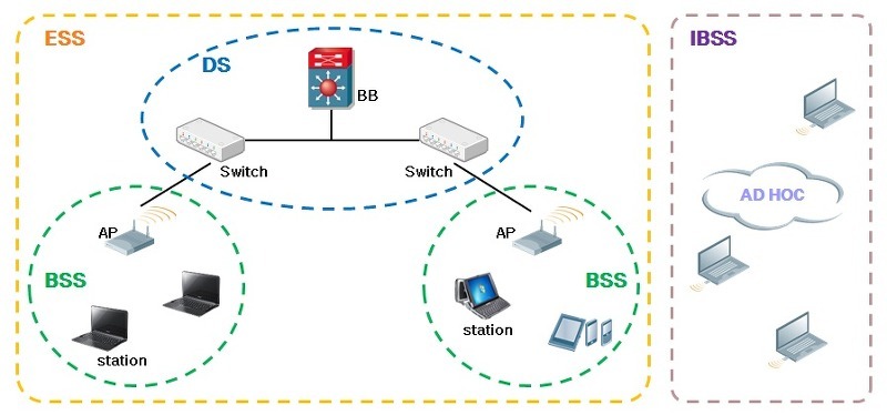 - BSS(Basic Service Set): WLAN의 가장 기초적인 구성요소이며, BSS내에 있는 AP(공유기)와 장치(station, 단말)들이 서로 통신이 가능한 구조이다. 하나의 AP만을 기반으로 구축되어 있다.