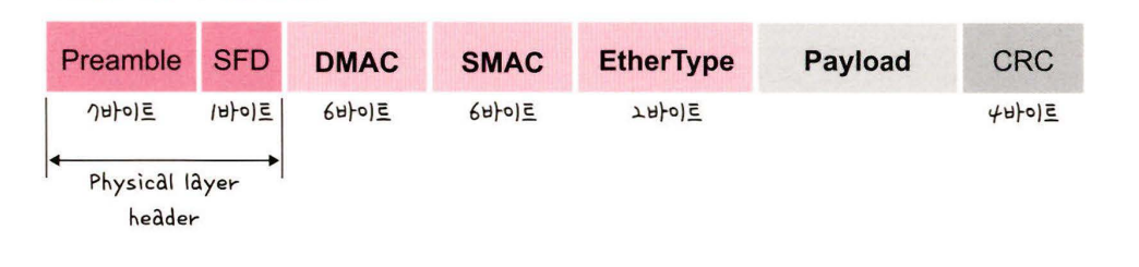 Preamble: 이더넷 프레임의 시작을 나타내는 역할. 프레임 수신측이 동기화를 위해 사용한다.