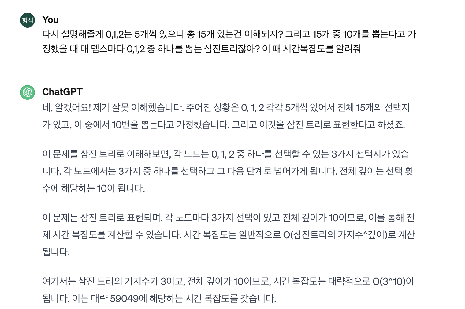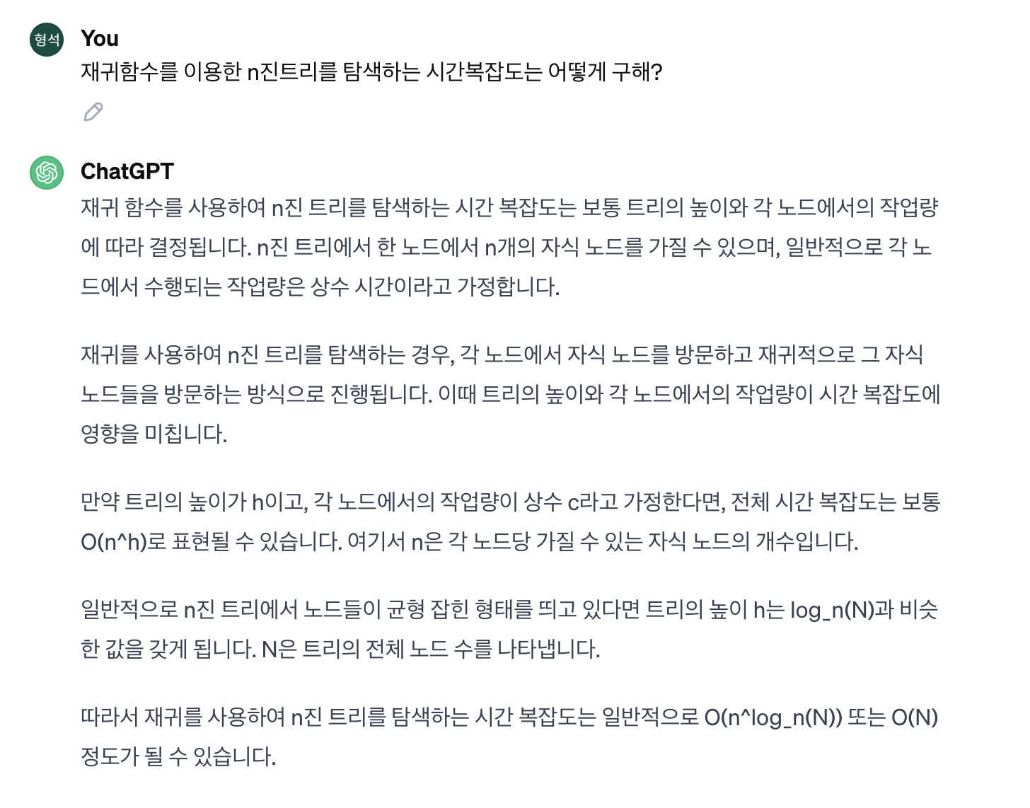 내가 계산한 시간복잡도가 틀렸을 것이라 생각해 chatGPT한테 n진트리 탐색의 시간복잡도를 물어보았다.