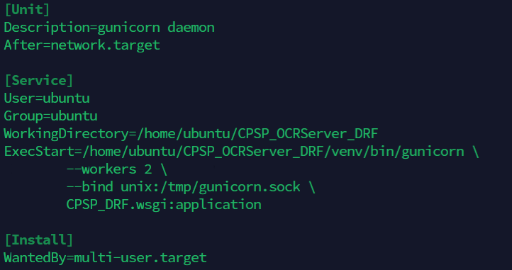 위 이미지는 CPSP프로젝트의 gunicorn을 서비스로 등록한 CPSP.service파일 내용이다.