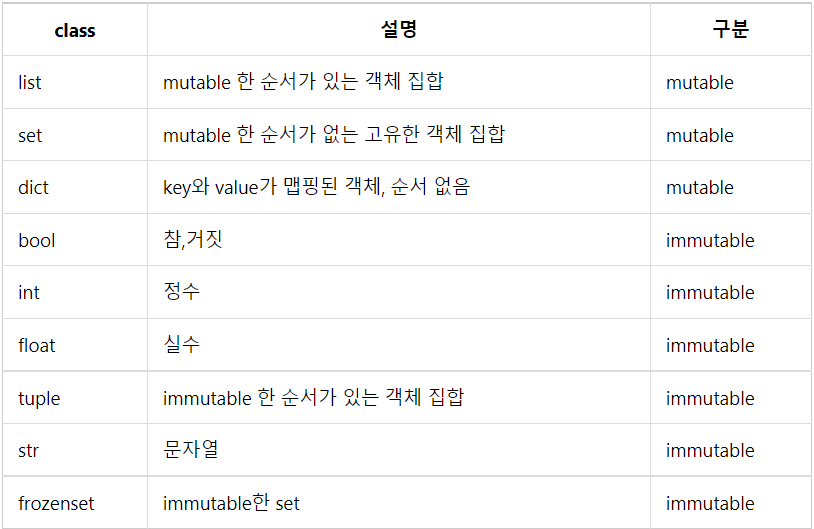 이제부터 데이터 타입별 mutable여부를 구분해보고 각 객체별 변수 대입 시 차이점을 살펴보자.