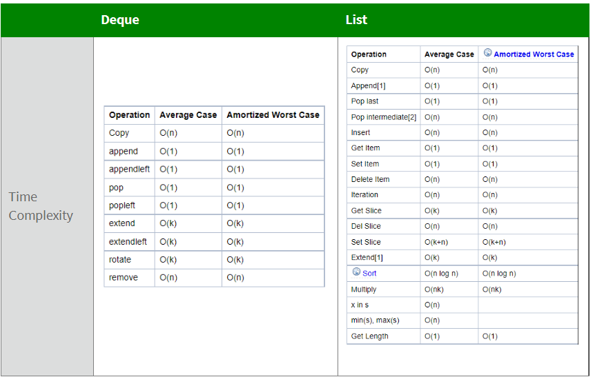 - python의 deque은 삽입/삭제 뿐만 아니라 탐색도 가능하다는 점이다. list클래스의 일부 메소드도 사용가능하다. 하지만 deque로 탐색을 하거나 list메서드를 사용한다? 이게 맞는지 다시 생각해보자 ㅎㅎ.. 참고로 deque은 선입선출 시에만 list보다 유리하므로 이 때를 제외한 나머지 상황에서는 굳이 사용하지 않도록 하자