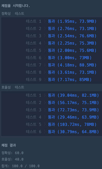 그 결과 정확성은 모두 맞을 수 있었고 효율성 테스트도 일부 통과할 수 있었다.