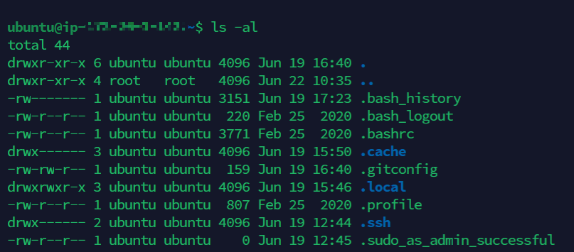 디폴트 유저인 ubuntu의 홈 디렉토리에서 ls -al명령어로 모든 파일을 조회해보면 .ssh 디렉토리를 확인할 수 있다.