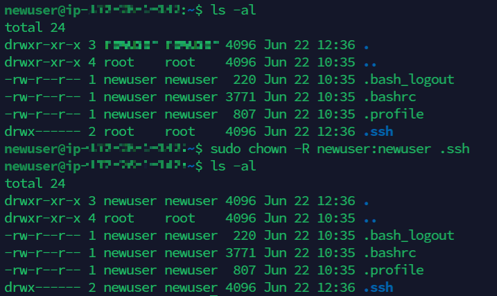 .ssh 디렉토리의 소유권이 root에서 newuser로 바뀐 모습을 볼 수 있다.